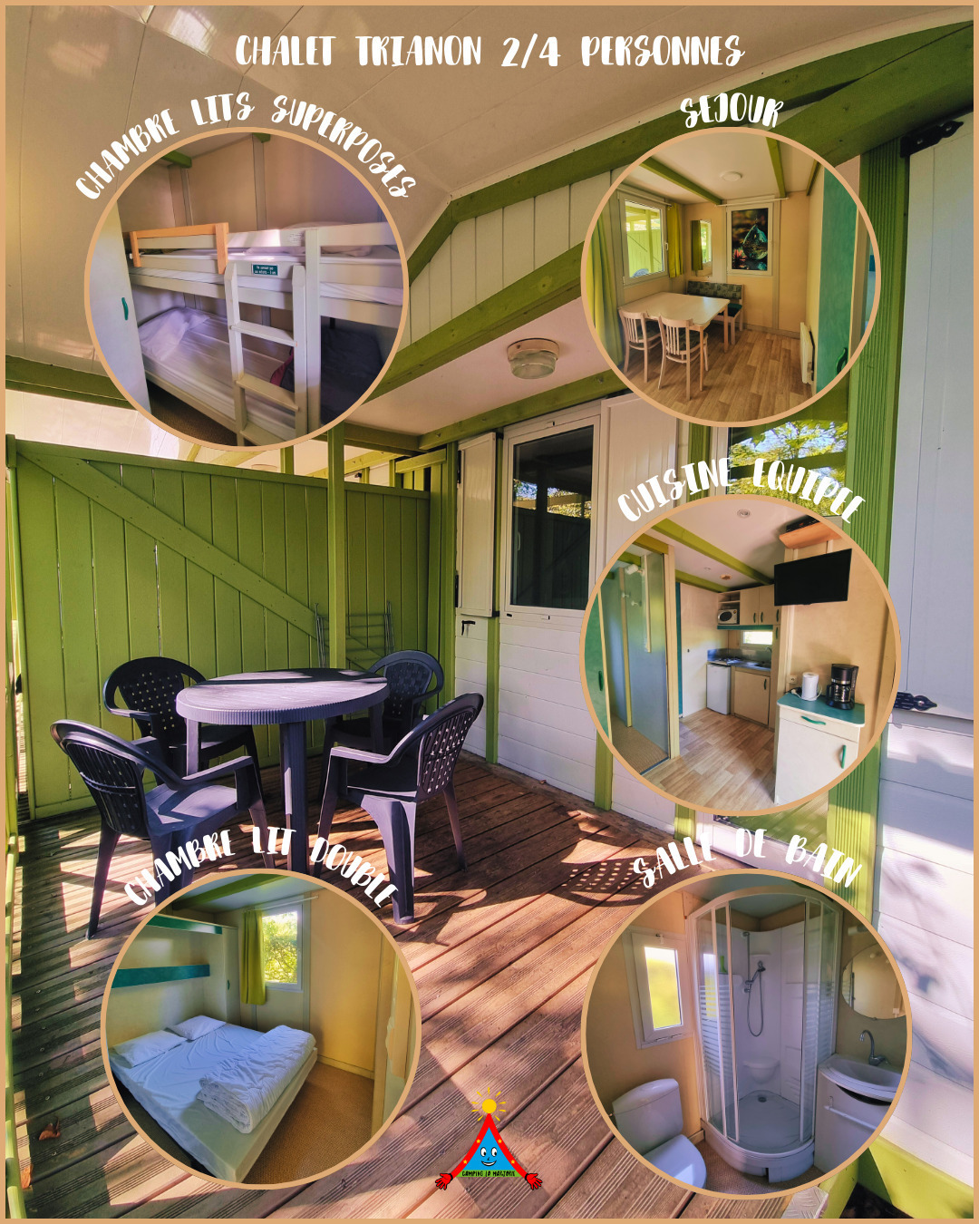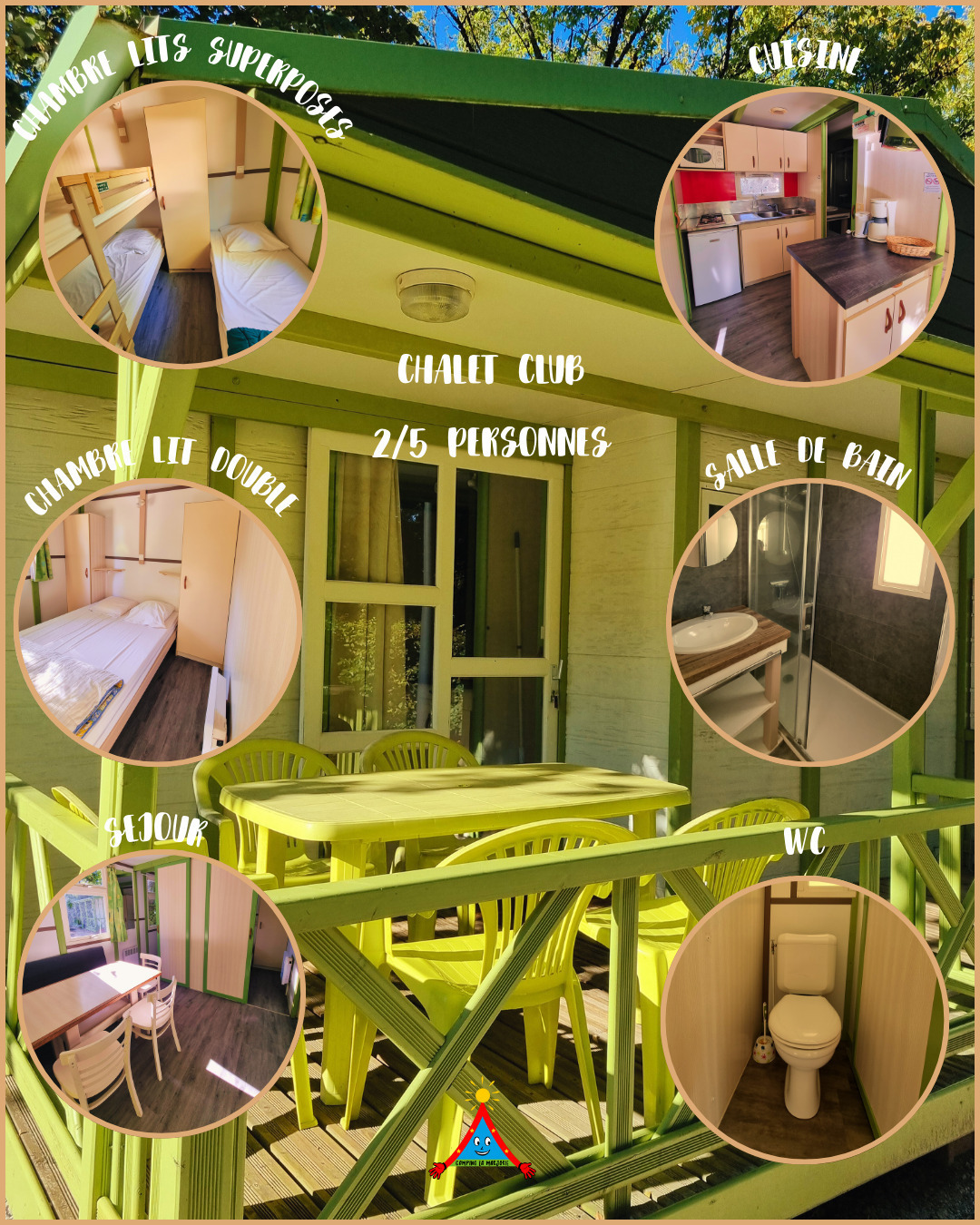 En couple, en famille, en groupes, le Camping de la Marjorie vous propose des locations de chalets de 2 à 7 personnes, tous équipés de toilettes et salle de bain (douche), cuisine, chambres, séjour et terrasse.
